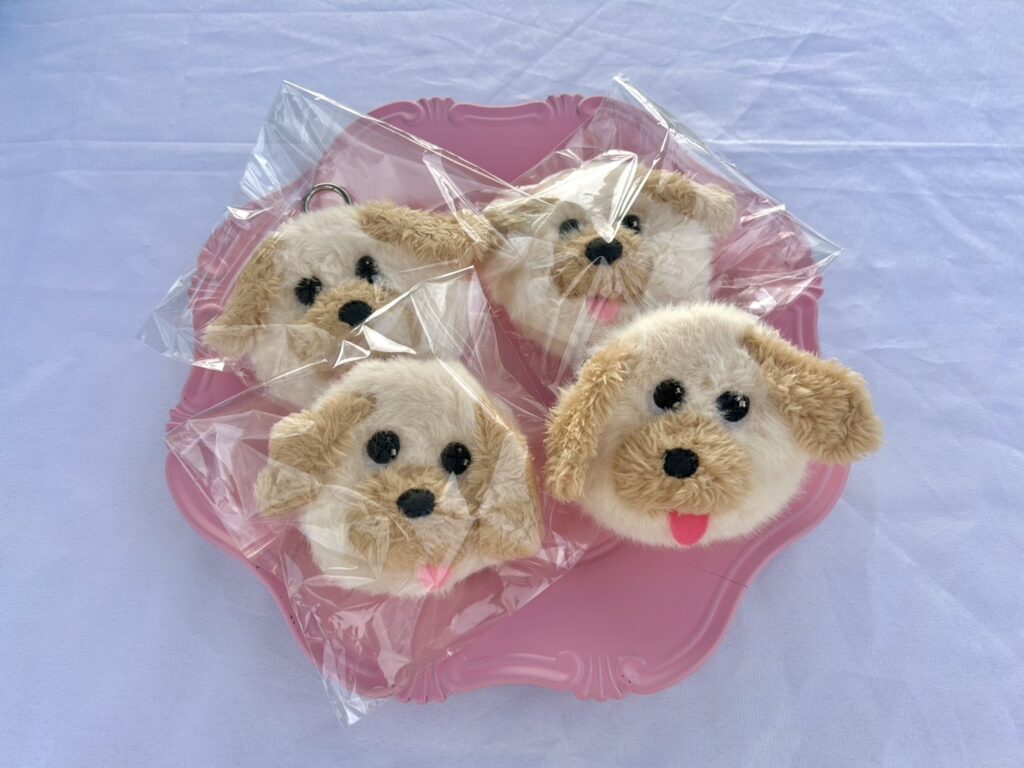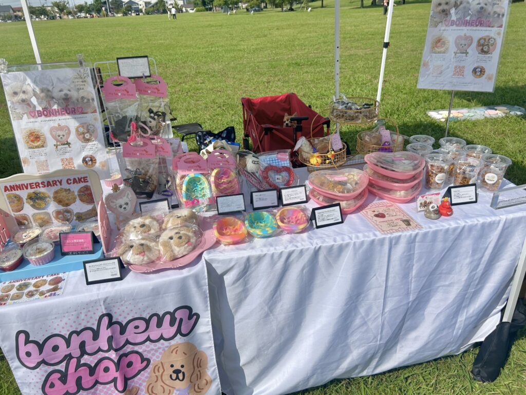 今回は野菜チップスとクッキーの詰め合わせと、大人気のフードボウル、わんこのチャーム、新しく入荷した楽しいおもちゃに加え、新商品の手作りわんこポーチ(エコバック入り)を販売しました。アニバーサリー・ケーキのご予約受付も好評いただいています。