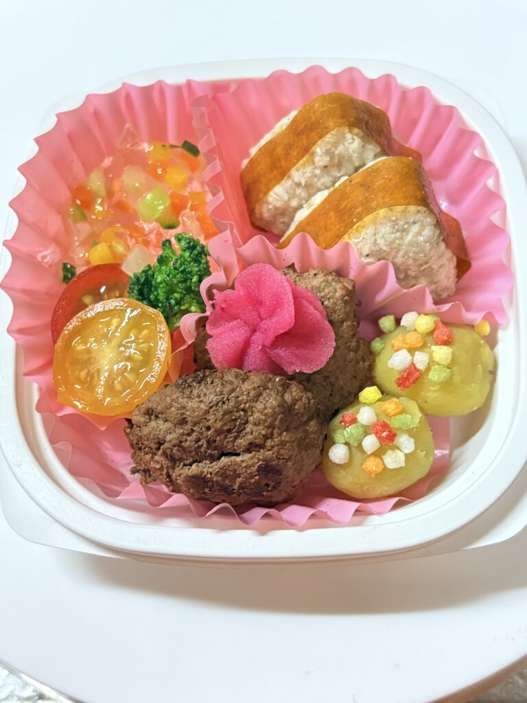 おむすび、ハンバーグ、さつまいも、野菜テリーヌと、少しずつ違う要素を入れることで、食べる楽しさにつながるようにしました。